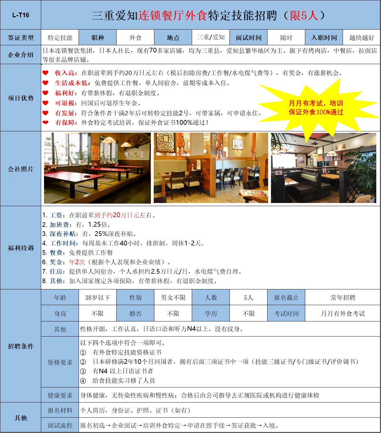 主要負責前廳服務和后廚幫廚(煮面,洗菜、配菜、清洗餐具)。免費提供工作餐,有獎金,有漲薪機會。回國后可退厚生年金。符合條件者干滿2年后可轉特定技能2號,可帶家屬,可申請永住。