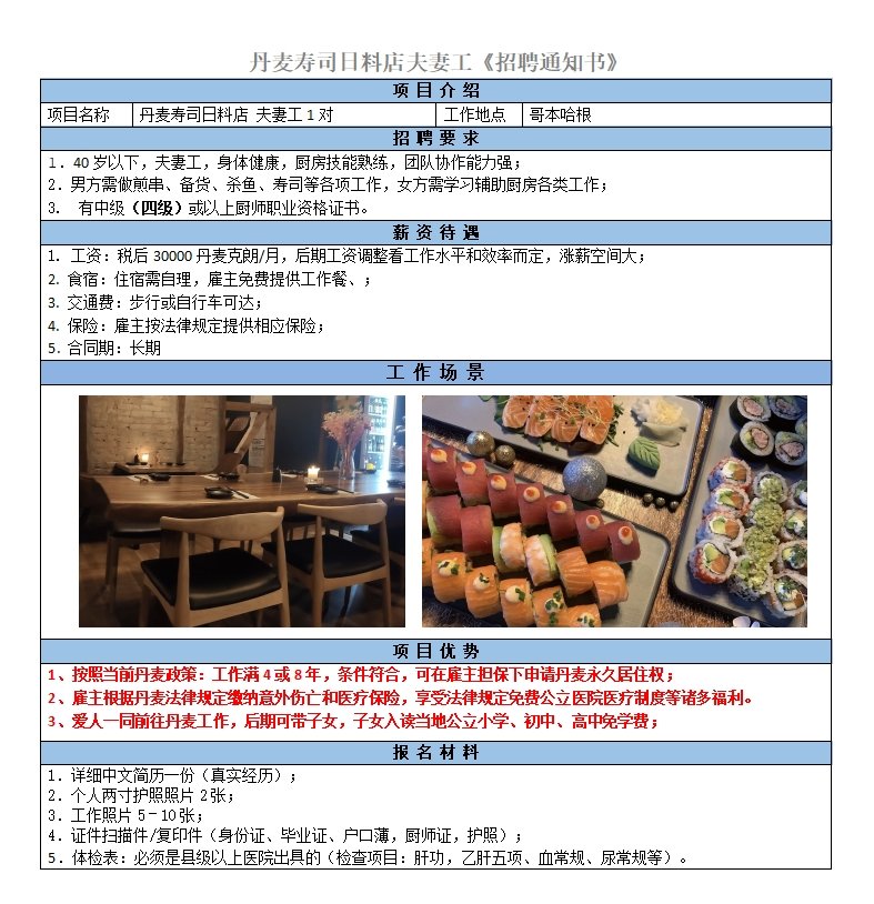 男方主要負責日料制作、女方負責壽司等其他廚房事務,男方會一點英語最佳;稅后22000丹麥克朗/月,后期根據表現漲薪