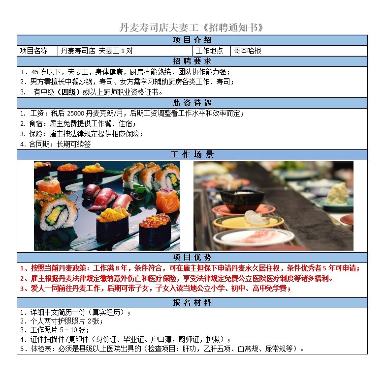 男方主要負責日料制作、女方負責壽司等其他廚房事務,男方會一點英語最佳;稅后22000丹麥克朗/月,后期根據表現漲薪
