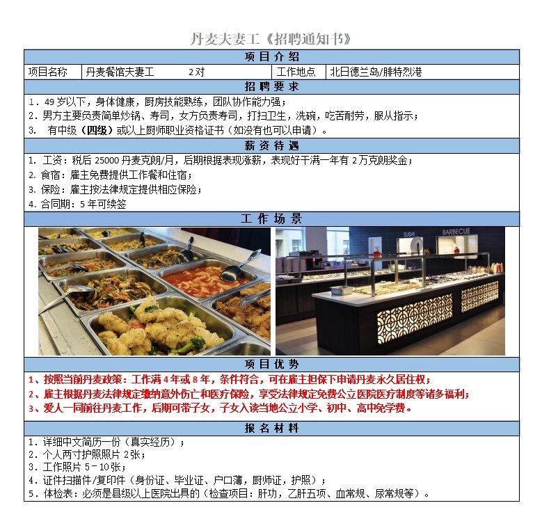 男方熟練炒鍋,擅長川菜;女方有無后廚經驗都可;稅后22000丹麥克朗/月,后期根據表現(xiàn)漲薪。