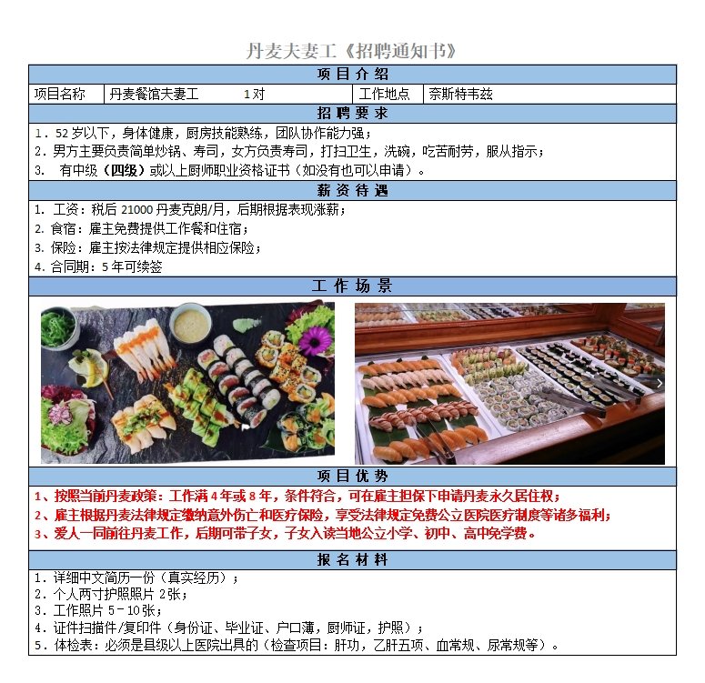 男方主要負責(zé)日料制作、女方負責(zé)壽司等其他廚房事務(wù),男方會一點英語最佳;稅后22000丹麥克朗/月,后期根據(jù)表現(xiàn)漲薪