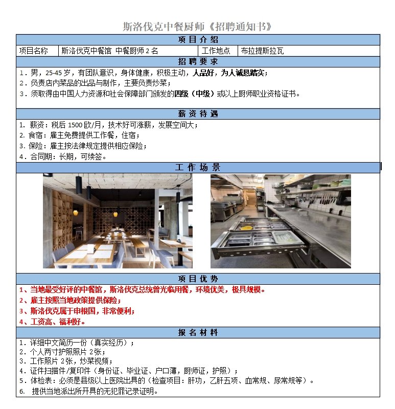 擅長川菜、北方菜、懂火鍋燒烤最好,可完成廚房全般工作,不挑活,工作主動性強,手腳麻利;須取得由中國人力資源和社會保障部門頒發(fā)的四級(中級)或以上廚師職業(yè)資格證書。英文需達到雅思(UKVI)各科4分,無英語成績者可培訓。
