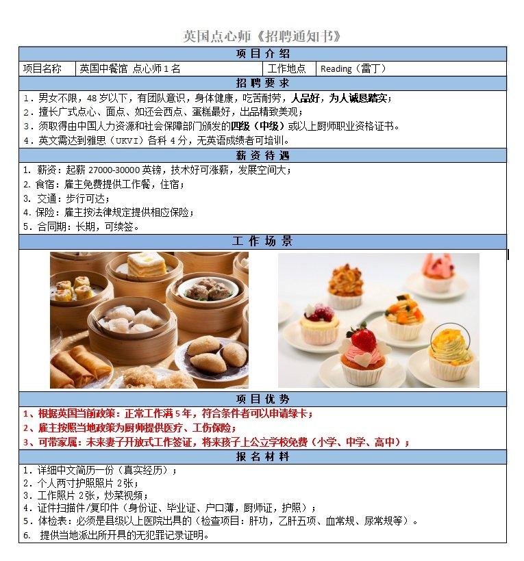擅長廣式點心、面點、如還會西點、蛋糕最好,出品精致美觀;須取得由中國人力資源和社會保障部門頒發的四級(中級)或以上廚師職業資格證書。英文需達到雅思(UKVI)各科4分,無英語成績者可培訓。