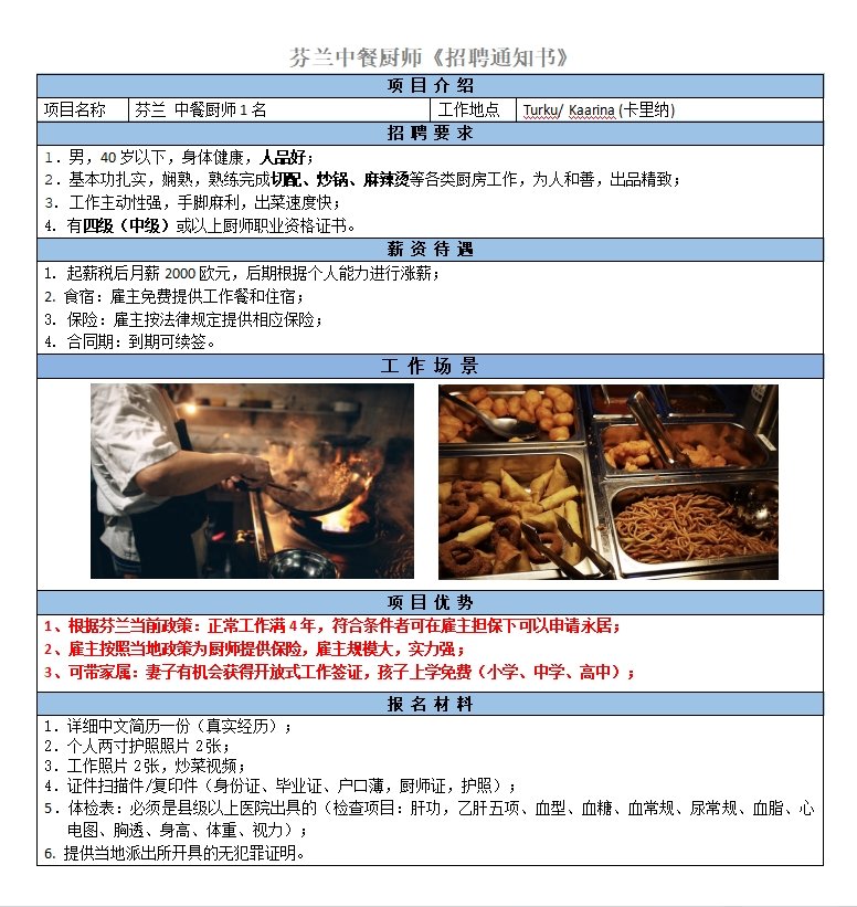 掌握基本的廚房技能,干活積極,主動性強; 有四級(中級)或以上廚師職業資格證書;15000歐元 包吃住