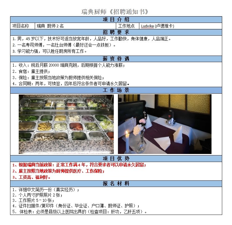 要求48歲以下,人品好,工作勤快,服從安排; 工作態度:積極主動,吃苦耐勞,有團隊精神,會壽司者更佳;稅后到手月薪19000瑞典克朗,后期根據個人能力漲薪