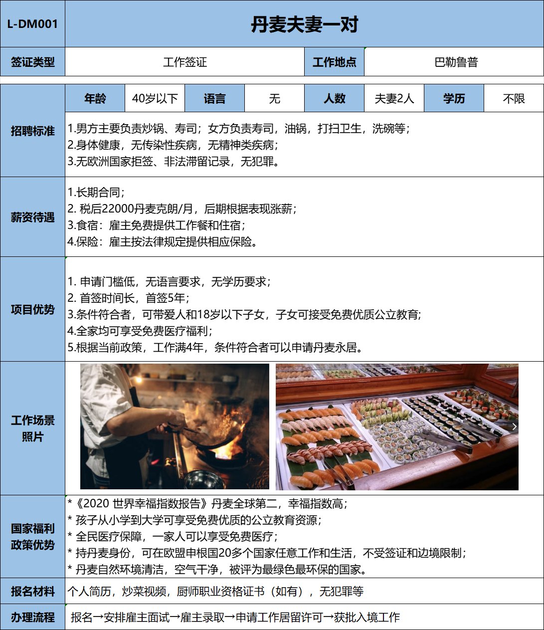 男方主要負責日料制作、女方負責壽司等其他廚房事務,男方會一點英語最佳;稅后22000丹麥克朗/月,后期根據表現漲薪