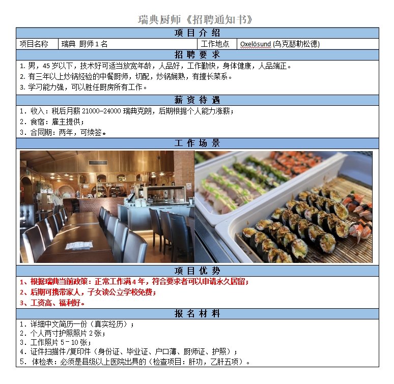 要求48歲以下,人品好,工作勤快,服從安排; 工作態度:積極主動,吃苦耐勞,有團隊精神,會壽司者更佳;稅后到手月薪19000瑞典克朗,后期根據個人能力漲薪
