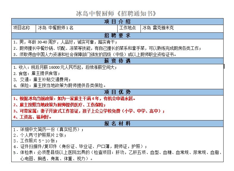 年齡43歲以內,3年以上炒鍋經驗;無地域要求;每天工作8小時,管吃管住26萬冰島克朗。