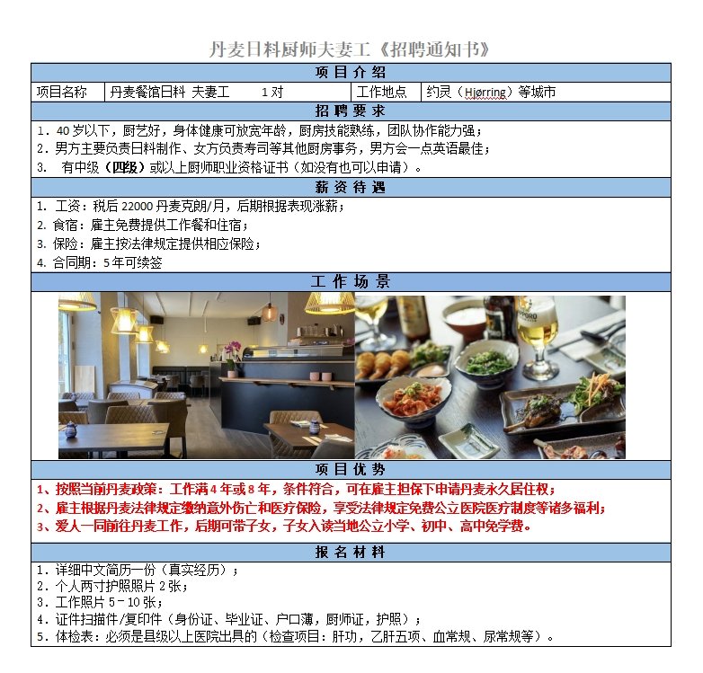 男方主要負責日料制作、女方負責壽司等其他廚房事務,男方會一點英語最佳;稅后22000丹麥克朗/月,后期根據表現漲薪