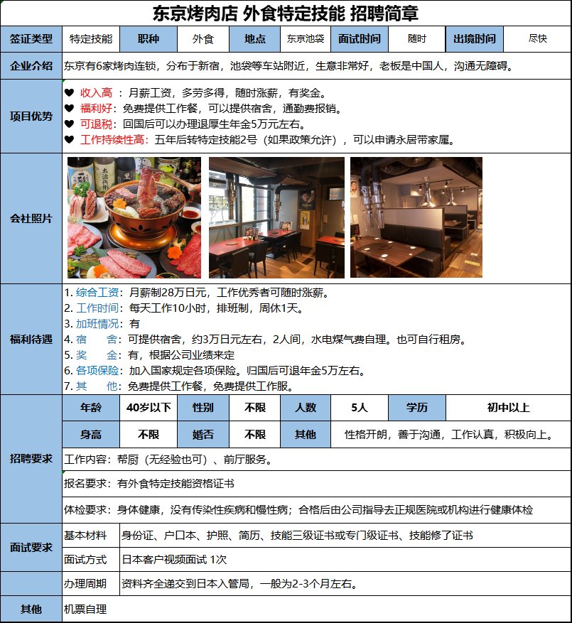 幫廚(無經(jīng)驗也可)、前廳服務,東京有6家烤肉連鎖,分布于新宿,池袋等車站附近,生意非常好,老板是中國人,溝通無障礙。