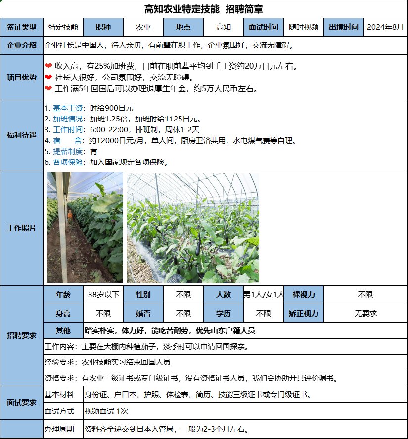 主要在大棚內種植茄子,淡季時可以申請回國探親。 收入高,有25%加班費,目前在職前輩平均到手工資約20萬日元左右。
