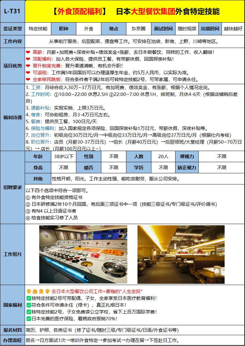 主要負責前廳服務和后廚幫廚(煮面,洗菜、配菜、清洗餐具)。免費提供工作餐,有獎金,有漲薪機會。回國后可退厚生年金。符合條件者干滿2年后可轉特定技能2號,可帶家屬,可申請永住。