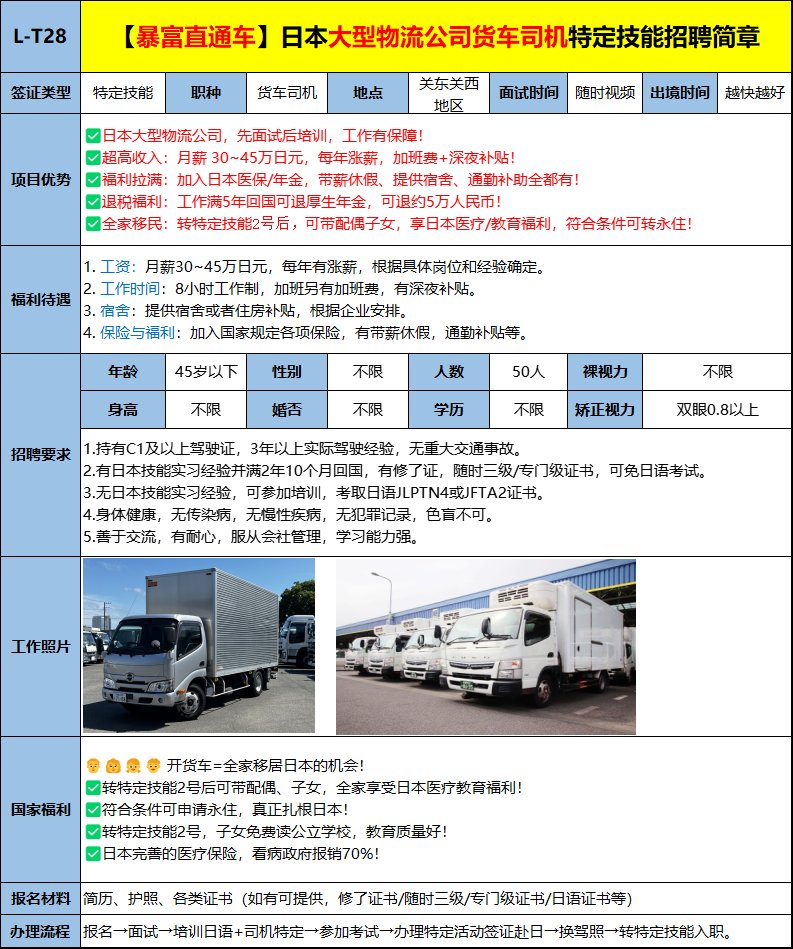 持有C1及以上駕駛證,3年以上實際駕駛經(jīng)驗,無重大交通事故。月薪30~45萬日元,每年有漲薪,根據(jù)具體崗位和經(jīng)驗確定。