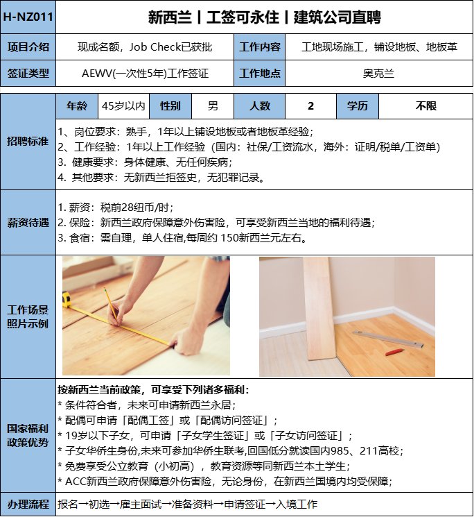 要求會熟練完成建筑木工工作,工作態度勤懇,服從指揮,稅前27.76新西蘭元/小時