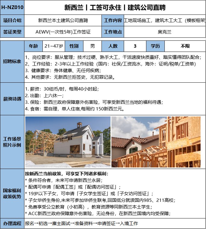 技術過硬、大工熟手,干活速度快質量好、踏實、懂得團隊配合、服從管理。三年以上海外建筑工作經驗,無新西蘭拒簽史,無犯罪記錄,需要培訓語言。