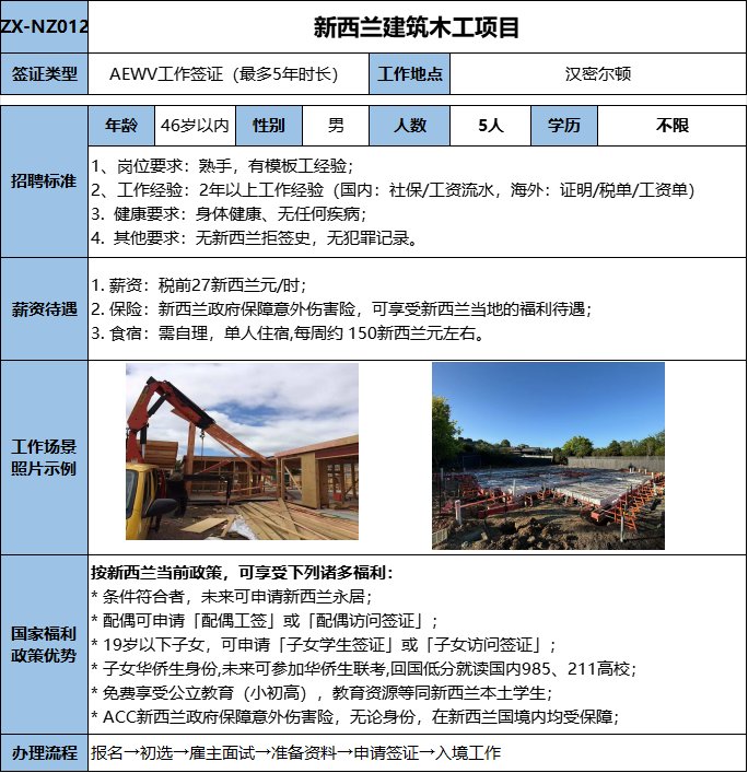 要求會熟練完成建筑木工工作,工作態(tài)度勤懇,服從指揮,稅前27.76新西蘭元/小時