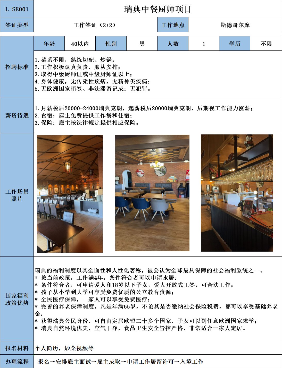 要求48歲以下,人品好,工作勤快,服從安排; 工作態(tài)度:積極主動,吃苦耐勞,有團(tuán)隊精神,會壽司者更佳;稅后到手月薪19000瑞典克朗,后期根據(jù)個人能力漲薪