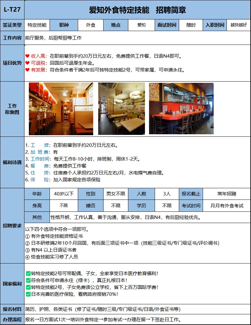 主要負責前廳服務和后廚幫廚(煮面,洗菜、配菜、清洗餐具)。免費提供工作餐,有獎金,有漲薪機會?;貒罂赏撕裆杲?。符合條件者干滿2年后可轉(zhuǎn)特定技能2號,可帶家屬,可申請永住。