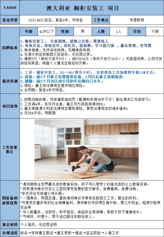 要求安裝櫥柜,1年以上相關工作經驗;年薪73150澳幣;
