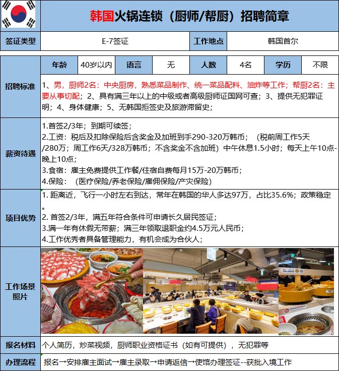 年齡45歲以內,男女都可,有出國經歷者優先;能做菜最好,表現好有機會升任廚師;工作踏實,性格溫順開朗,服從意識強;無犯罪記錄;學歷不限;提供中級或高級廚師證,需要三年前的證書,如果二級技師證沒有時間限制(可協助辦理),費用自理。