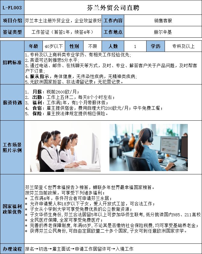 芬蘭高薪項目:包吃住,包水電,住宿地點離餐廳步行十分鐘,月薪2400歐(接近1.7w人民幣)純凈到手收入,要求40歲以下踏實樸實的師傅,不限地域不限菜系。