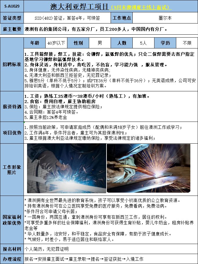 赴澳大利亞(墨爾本/布里斯班)- 焊工/氬弧焊工