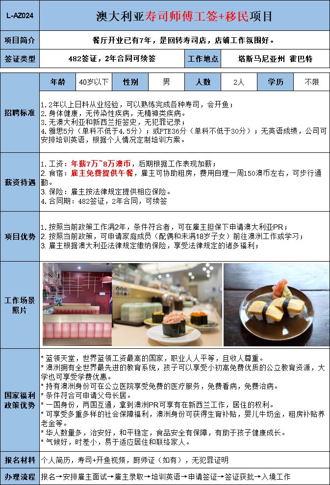 壽司師傅,2年以上日料從業經驗,可以熟練完成各種壽司,會開魚