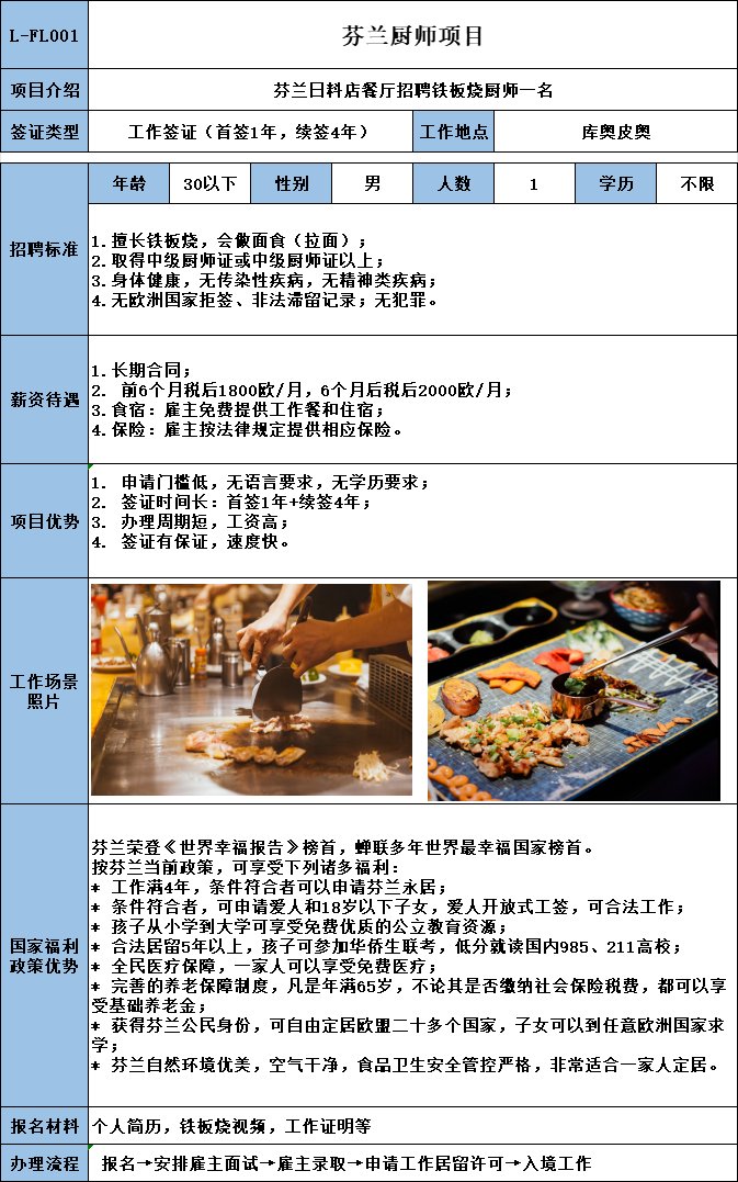 芬蘭高薪項目:包吃住,包水電,住宿地點離餐廳步行十分鐘,月薪2400歐(接近1.7w人民幣)純凈到手收入,要求40歲以下踏實樸實的師傅,不限地域不限菜系。