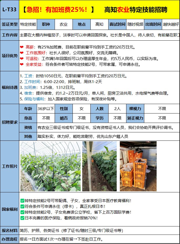 主要在大棚內種植茄子,淡季時可以申請回國探親。 收入高,有25%加班費,目前在職前輩平均到手工資約20萬日元左右。