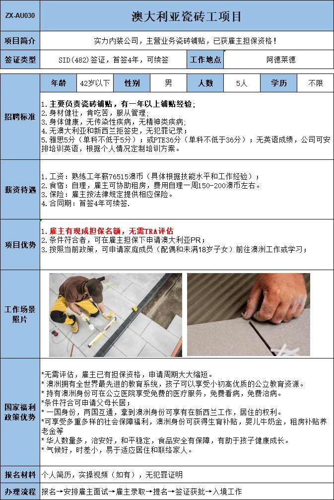 實力內裝公司,主營業務瓷磚鋪貼,已獲雇主擔保資格!年薪73150澳幣,多勞多得,工資漲薪潛力極大