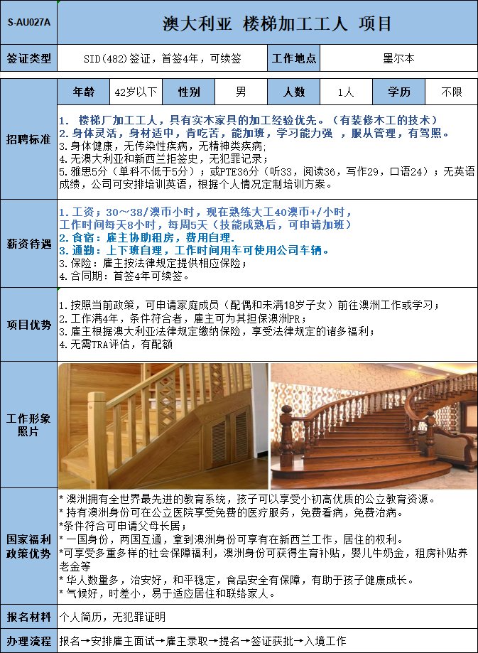 主要負責木地板鋪貼,有木地板鋪貼經驗優先。熟練工年薪76515澳幣(具體根據技能水平和工作經驗)
