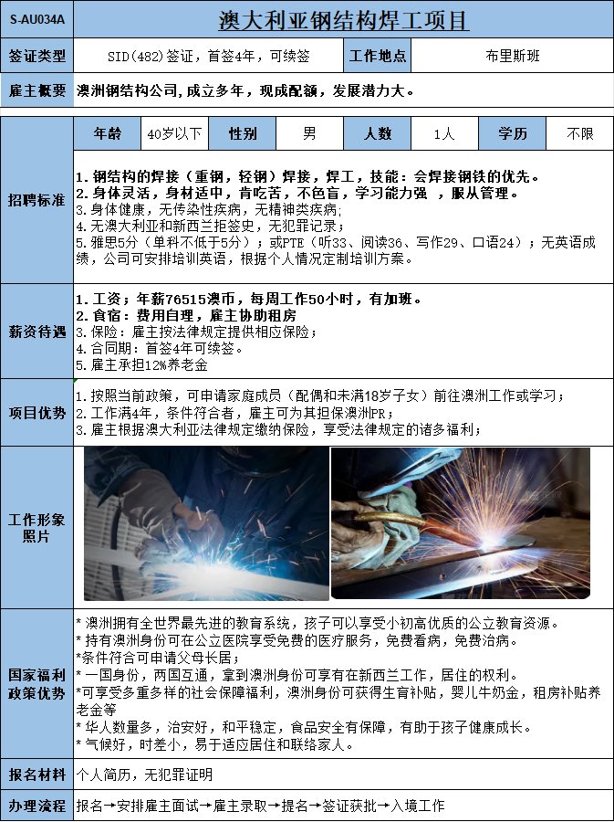 焊接鋁板和鐵板,二保焊熟練工,年薪76515澳幣,雇主支付12%養老保險。