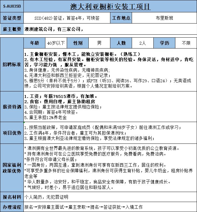 鋁合金門窗安裝2人;稅前38澳幣/小時,8個小時之外算加班 (按照法律規定)現在職工人稅前2400澳幣/周(含加班)