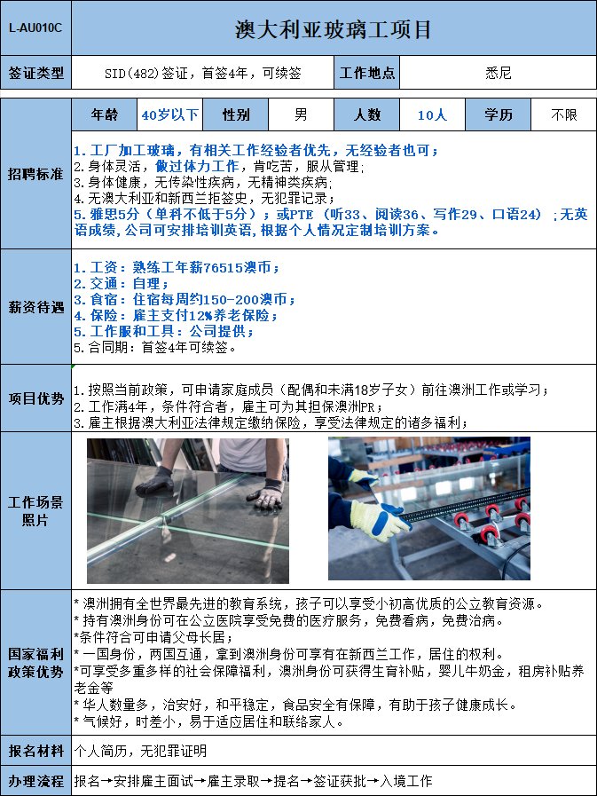 噴涂工,有相關(guān)工作經(jīng)驗者優(yōu)先,無經(jīng)驗者也可;熟練工年薪76515澳幣;雇主支付12%養(yǎng)老保險.