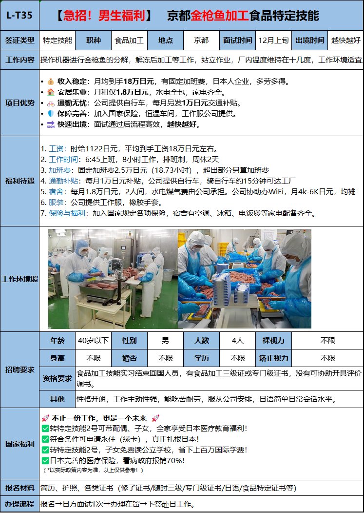 主要負(fù)責(zé)前廳服務(wù)和后廚幫廚(煮面,洗菜、配菜、清洗餐具)。免費(fèi)提供工作餐,有獎(jiǎng)金,有漲薪機(jī)會(huì)。回國(guó)后可退厚生年金。符合條件者干滿2年后可轉(zhuǎn)特定技能2號(hào),可帶家屬,可申請(qǐng)永住。