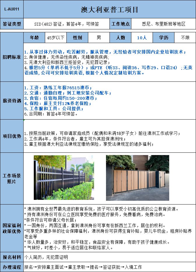 實力公司,主營家居建材,主要負責鋪設瓷磚、地板,1年以上相關工作經驗;年薪73150澳幣,多勞多得,工資漲薪潛力極大