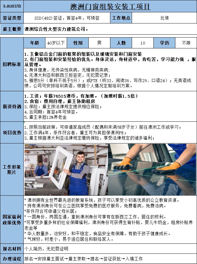 鋁合金門窗安裝2人;稅前38澳幣/小時,8個小時之外算加班 (按照法律規定)現在職工人稅前2400澳幣/周(含加班)