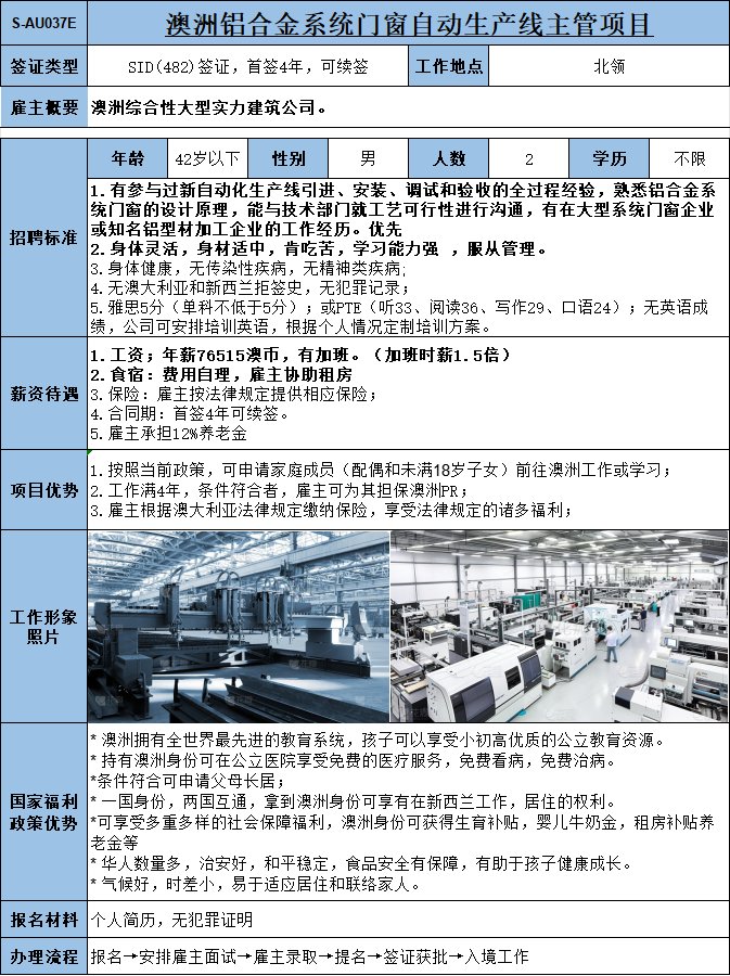 ? 現(xiàn)成名額,申請(qǐng)快,歡迎有成績的朋友 ? 全澳多家倉庫,雇主實(shí)力可靠 ? 無需技術(shù)背景,有體力勞動(dòng)經(jīng)驗(yàn)、能吃苦即可 ? 無相關(guān)經(jīng)驗(yàn)可安排國內(nèi)企業(yè)實(shí)習(xí) ? 雇主支持女士作為主申請(qǐng)人,夫妻一起