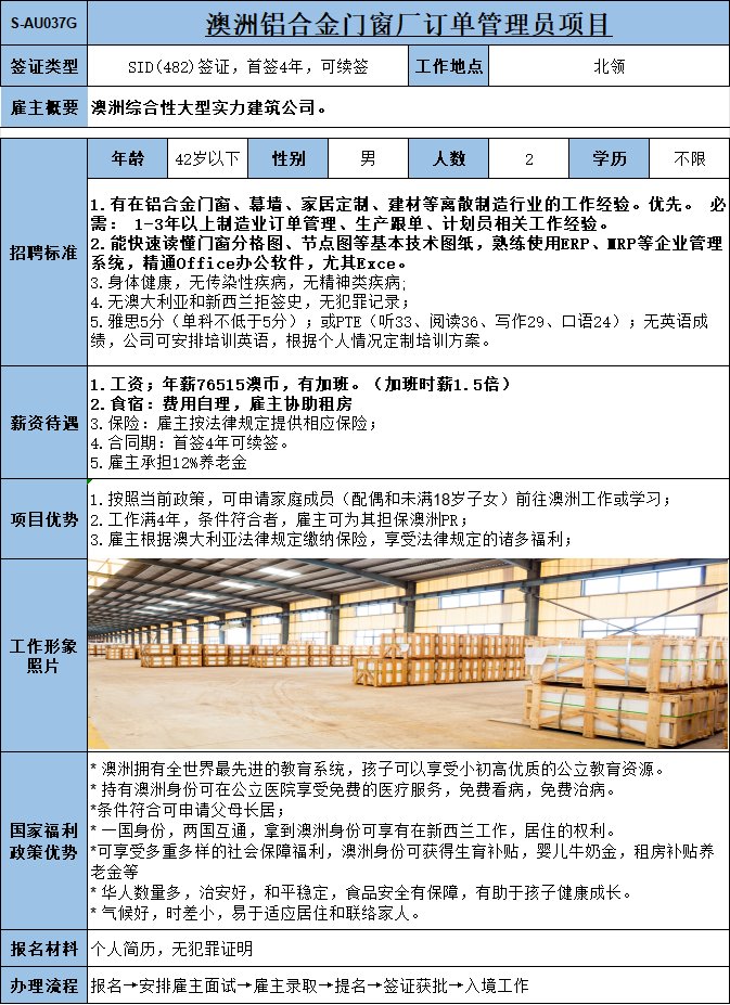 赴澳大利亞(北領)- 鋁合金門窗廠訂單管理員